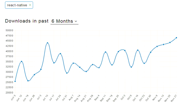 另一方面,React Native(来自Facebook)对本地app采用完全不用的开发路径。它使用Java代码,类似CSS的样式表和所有太熟悉的类似HTML的标签来布局。这里有一个图表可以清楚地了解React Native的受欢迎程度:
